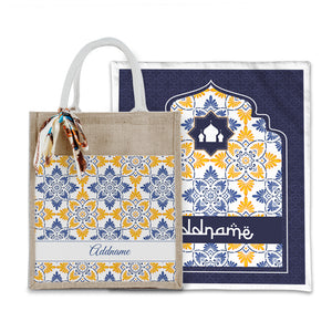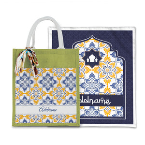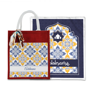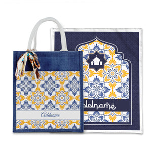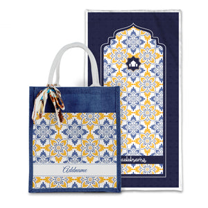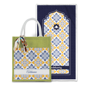 Arabesque Butter Blue Sejadah with Matching Colourful Jute Bag