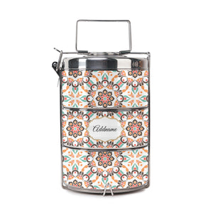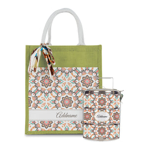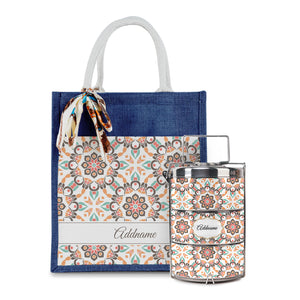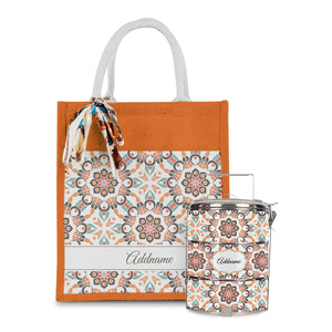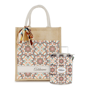 Arabesque Geo Brown Colourful Jute Bag with Tiffin Carrier Set