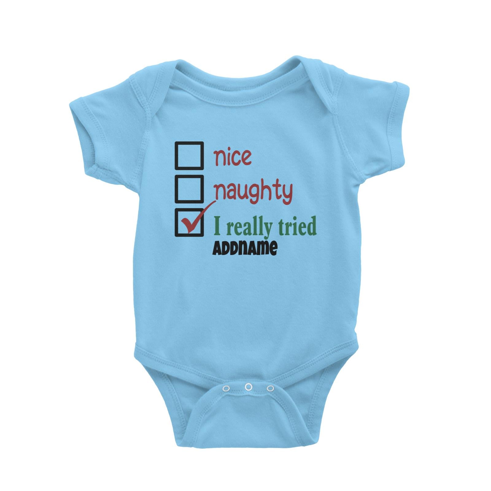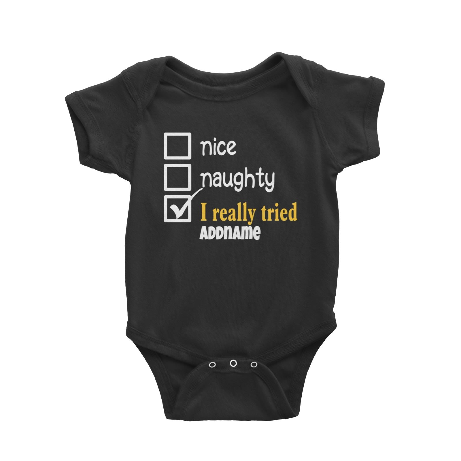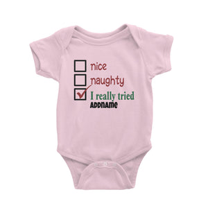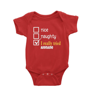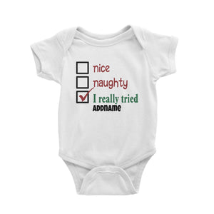Xmas Nice Naughty I Really Tried" Baby Romper is a great way of making a statement! Made with 100% cotton, High Quality and Comfortable to wear. Get them personalised, and in matching Family Outfits as well!