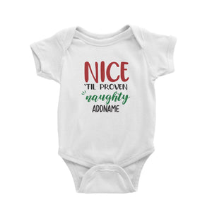 Xmas Nice till Proven Naughty" Baby Romper is a great way of making a statement! Made with 100% cotton, High Quality and Comfortable to wear. Get them personalised, and in matching Family Outfits as well!