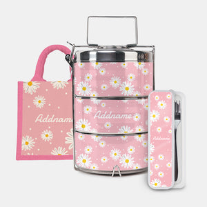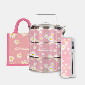 Daisy Series Half Lining Lunch Bag, Standard Tiffin Carrier And Cutlery Set - Blush Light Pink