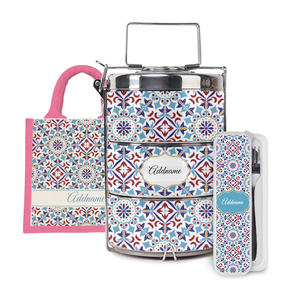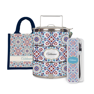 Moroccan Series - Arabesque Agean Blue Half Lining Lunch Bag, Tiffin Carrier and Cutlery Set