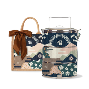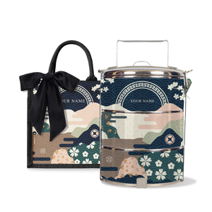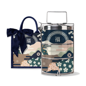 Fortune Garden (Navy Design) - Lunch Tote Bag with Three-Tier Tiffin Carrier