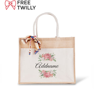 Peony Flower Jute Bag with Front Pocket