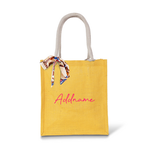 Yellow Full Colour Jute Bag with Florence Pink Personalization