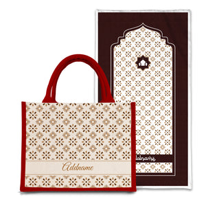 Arabesque Tawny Brown Sejadah Prayer Mat with Half Lining Small Jute Bag Bundle