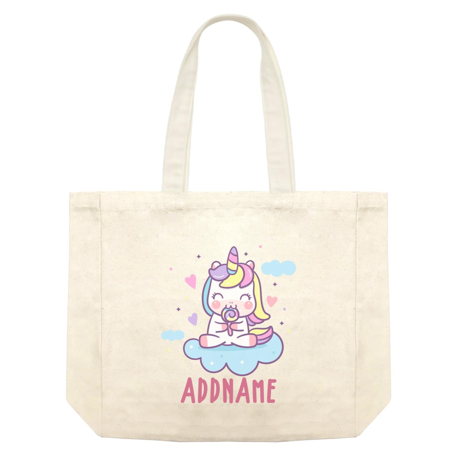 Unicorn And Princess Series Cute Unicorn Eating Lolipop Addname Shopping Bag is made with 100% canvas cotton, and can be personalised with a name. Each Shopping Bag measures 38cm x 47cm layflat, and can be expanded to store wider items. Super versatile for use all year round!