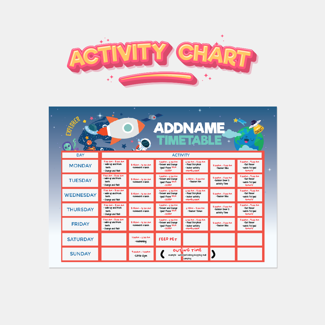 Introducing Kids Time Table with Personalisation. The best way to teach it is by helping them to make a schedule of their daily routine. We have created these beautiful weekly timetables for kids that will help your kids plan their whole day. We are sure kids are going to be obsessed with their timetable template. Make sure your kids try to complete tasks on time and follow the timetable. It has multiple designs to choose from & available in A2 size.