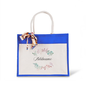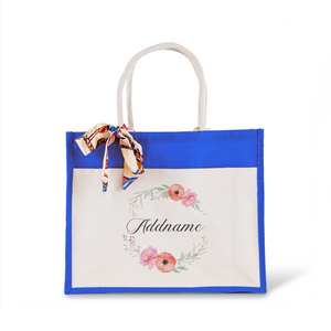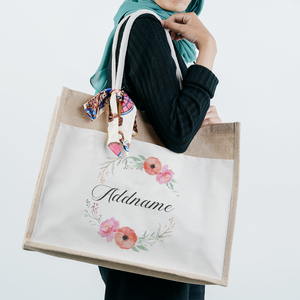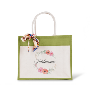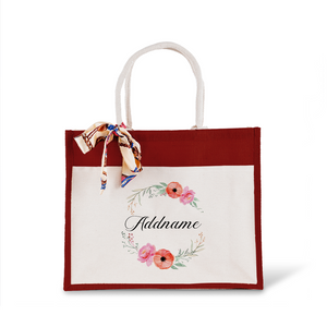 Elegant Flower Wreath Jute Bag with Front Pocket