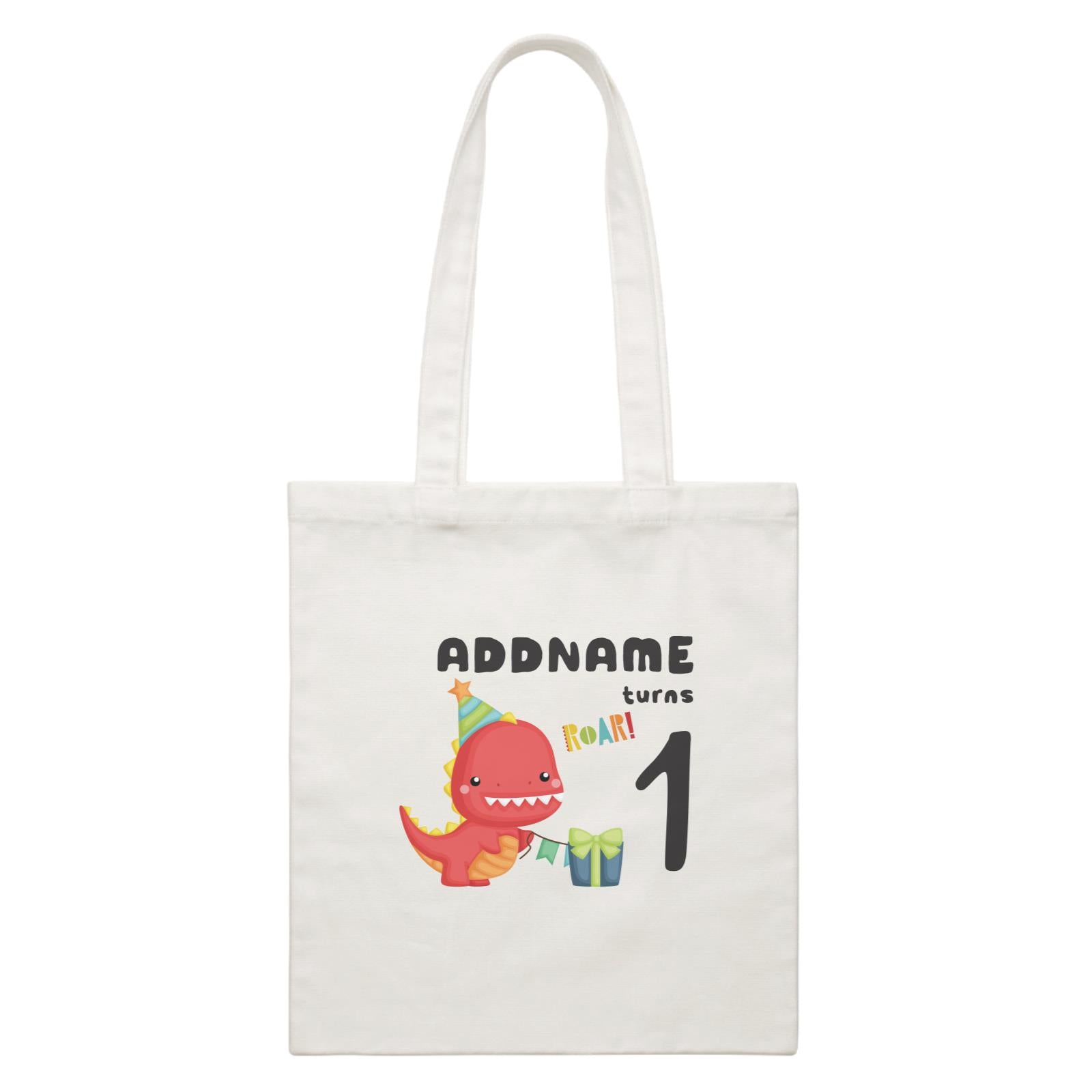 Birthday Dinosaur Happy Red Rex Wearing Party Hat Addname Turns 1 White Canvas Bag